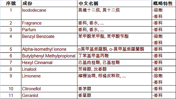 百優精純乳霜一共添加了11種香料,詳見下表翻譯
