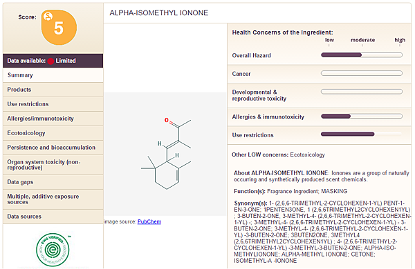 Alpha-isomethyl ionone (α異甲基紫羅酮) : 過敏問題。