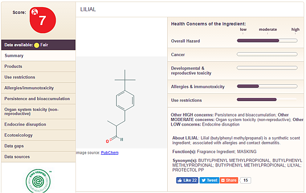 ButylphenylMethylpropional / Lilial (丁苯基甲基丙醛) : 過敏、皮膚炎、 內排泄失調且會積累於體內。